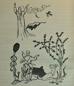 – Нас было тоже трое братьев. Мы тоже один за другим выехали из дома, чтобы найти соловья горной долины. Сколько трудностей мы перенесли в пути, сколько страдали - и рассказать трудно. Но мы так и не добрались до страны, в которой живет соловей горной долины. От страданий и лишений я превратился в пепел. Мои два брата уехали дальше меня, а я отстал. Хорошо еще, что я могу дать приют путникам, едущим на поиски соловья горной долины. Послушай меня, не губи и себя и других, возвращайся лучше в отцовскую страну.