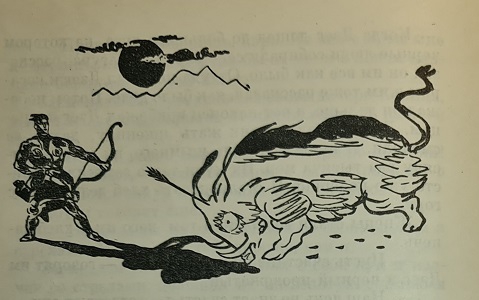 Дзег уложил одной стрелой большого гуся и распорол его. Когда из гуся вылетел ястреб и высоко-высоко поднялся в небо, Дзег пустил в него стрелу. Хороший был охотник Дзег, его стрела без промаха попадала в глаз летящего орла, и стрела его пронзила ястреба в самое сердце. Когда ястреб упал на землю, из него выскочила утка, бросилась в черную реку, да не сверху стала плавать, а нырнула на самое дно. Но стрела Дзега достала утку и на дне. Всплыла утка на поверхность, и волны черной реки понесли ее вниз по течению.