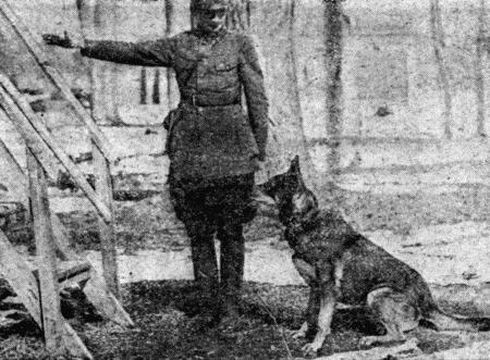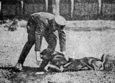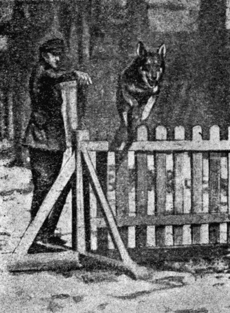 Когда же собака начинает уже уверенно подниматься и спускаться с лестницы, то ее пускают самостоятельно, сняв предварительно поводок; первоначально ее усаживают у лестницы и посылают (рис. 23), если же дрессировщик заметит, что собака при вхождении на лестницу собирается остановиться, то сейчас же со строгой интонацией дает команду «лестница», чем и заставляет собаку продолжать движение вверх. При входе собаки на площадку лестницы дается команда «сидеть», после небольшой выдержки дается подзывная команда «ко мне». Таким способом собака тренируется столько времени, сколько потребуется для полного закрепления приема, что конечно зависит как от индивидуальных качеств собаки, так и от уменья и опыта дрессировщика.