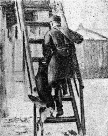 При первоначальном обучении собаки хождению по лестнице на собаку необходимо надевать шлейку во избежание падения собаки с лестницы. Часто наблюдается, что неохотно идущая на лестницу собака пятится, упирается и может ошейник снять; вот на этот случай и желательно иметь на собаке шлейку, чтобы избежать падения собаки. Собака подводится к лестнице, дрессировщик усаживает собаку, привлекает ее внимание на лестницу и дает команду «лестница». Затем коротко держа поводок у шлейки или у ошейника, дрессировщик вместе с собакой идет на лестницу (рис. 22), при входе дается поощрительная команда: «лестница, хорошо», и дрессировщик совместно с собакой начинает медленно подниматься по лестнице, все время наблюдая за собакой и в нужные моменты поправляя ее. При входе на площадку, дрессировщик усаживает собаку и с поощрением дает ей лакомство. Сделав выдержку, дрессировщик спускается с лестницы лицом к собаке, держа поводок в левой руке и дает команду «ко мне». При спуске собаки с лестницы дрессировщик также все время следит за собакой и в нужные моменты поправляет и поощряет ее. Нахождение дрессировщика перед собакой лишает возможности собаку спускаться прыжками.