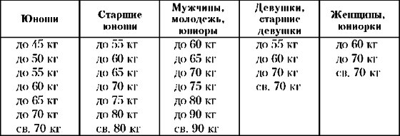 Участники соревнований делятся на весовые категории (табл. 4.1).