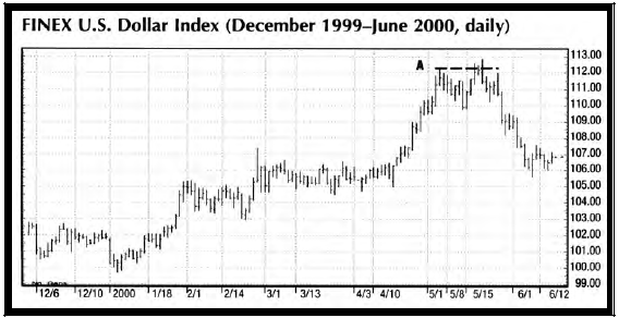 Простые механические системы работы на прорыве стали популярны в 80-х годах и остаются таковыми по сей день. Рис. 14 показывает прорывающий гэп, который последовал за днем с самым узким диапазоном торговли за последние три недели. Гэпы являются формой импульса и ведут к продолжению в направлении закрытия. Обратите внимание на совершенный "тест" в точке А.