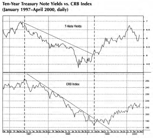 Рис. 15 показывает сравнение Индекса CRB (корзина из 17 товарных рынков) и доходности 10-ти летних казначейских обязательств (10-year Treasury note), которые стали опорной точкой в долгосрочных процентных ставках США. Левая часть графика показывает, что снижение долгосрочных ставок совпадает с падением товарного индекса в течение большей части 1997 и 1998 годов, (поскольку страхи глобальной дефляции выталкивали деньги из товаров для вложения в казначейские облигации и обязательства. Оба рынка начали менять направление в конце 1998 и начале 1999 годов. Хотя доходность 10-ти летних бумаг повернула наверх в четвертом квартале 1998 года, она не смогла прорвать свою двухлетнюю понижающуюся трендовую линию до марта 1999-го. Это случилось в тот самый момент, когда товарный индекс достиг дна и начал повышаться.