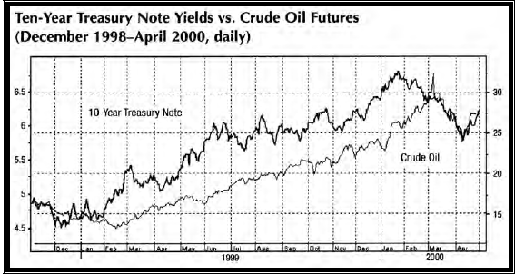 Несмотря на конечный рост, Индекс CRB был удерживаем, в первой половине 1999 года, относительно слабыми сельскохозяйственными рынками и, возможно, не совсем достоверно отразил угрозу инфляции на товарных рынках в целом. Другие товарные индексы, типа, Сырьевого Индекса Журнала Коммерции (Journal of Commerce (JOG) Raw Materials Index) и Товарного индекса Голдман Сакс (Goldman Sachs Commodity Index (GSCI)), росли в начале года значительно быстрее, чем Индекс CRB. Сырьевой индекс JOG развернулся наверх в первой половине года и был, подвержен влиянию, в основном, новых бычьих рынков алюминия, меди и других экономически чувствительных товаров. Индекс GSCI, который сильно зависит от цен на энергию, также сильно вырос, благодаря утроению цен на нефть. Скачок нефтяных цен оказал драматический и безошибочный эффект на процентные ставки.