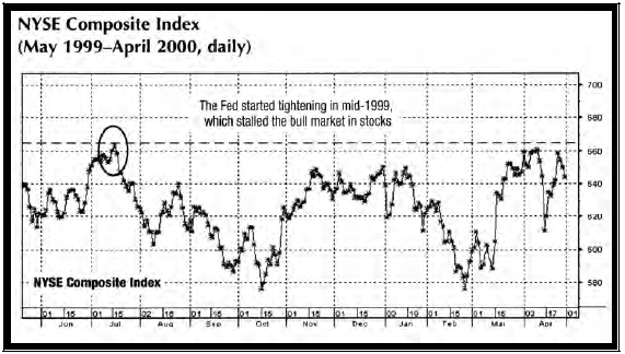 Обычно, предполагается, что повышение ставок будет иметь отрицательное влияние на рынок акций. Это негативное влияние имело место в 1999 году и весьма коварным образом. Хотя акции "новой экономики" резко выросли в цене в течение второй половины 1999 года, бумаги "старой экономики" прекратили рост как раз в тот момент, когда ФРС начала ужесточать политику в середине года. Рис. 17 показывает, что совокупный индекс Нью-йоркской биржи (NYSE Composite Index) имел максимум в июле 1999 года. Девять месяцев спустя, в мае 2000-го, этот индекс был на 5 % меньше своего пика предыдущего лета. Индекс Доу-Джонса (DJIA, Dow Jones Industrial Average) потерял 8 % за эти девять месяцев.