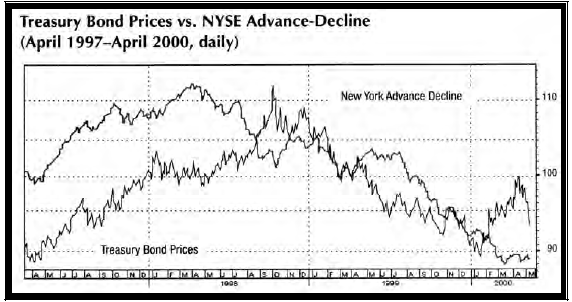 Наиболее драматично влияние повышения ставок отразилось на более широком рынке, чем рынок, охватывающий индексные бумаги. Например, Рис. 18 сравнивает цену казначейских облигаций и линию отношения количества поднявшихся бумаг к количеству опустившихся на Нью-йоркской фондовой бирже (NYSE Advance-Decline line) и показывает значительное сужение рынка в 1999 году. График показывает, что широкий рынок был более сильно задет повышением