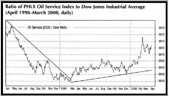 Вообще говоря, лучше фокусировать капитал на тех рыночных группах, которые опережают (outperforming) остальной рынок, что проявляется в подъеме линии коэффициента. Рис. 19 показывает, что бумаги сектора нефтяных услуг были недостаточно эффективны (underperforming) в течение 1998 года (в силу падения цен на нефть). Драматический рост в первой четверти 1999 года, (идентифицированный прорывом вверх понижающейся трендовой линии), сигнализировал межрыночному чартисту, что нефтяные цены начали превосходить индекс Доу-Джонса и являются хорошим приложением капитала на следующий год. Рост энергетических бумаг в начале 1999 года, также подкрепил подозрения чартиста, что нефтяные цены должны быть еще выше, так как, обычно, существует сильная положительная корреляция между нефтяными акциями и ценами на нефть. В то же время, как нефтяные бумаги имеют выгоду от роста цен на нефть, другие отраслевые группы, в результате, страдают.