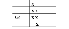 Давайте предположим, что акции Sears закрылись вчера по $40. Простейшей формой построения диаграммы "крестики-нолики" для этой бумаги будет использование ячейки размером в 1$ и создание одноячеечной диаграммы разворота. Размер ячейки в 1$ подразумевает запись каждого движения величиной в 1 доллар. Диаграмма одноячеечного разворота подразумевает использование всех поворотов цены. Итак, для обозначения того, что бумага закрылась вчера по 40$, разместим "Х" чуть выше горизонтальной линии, обозначающей 40$: