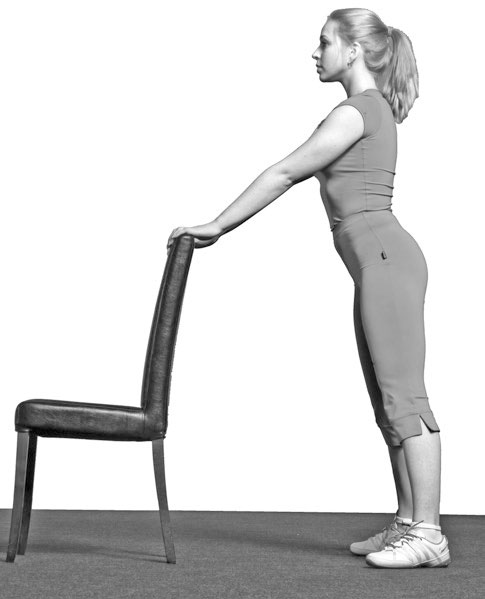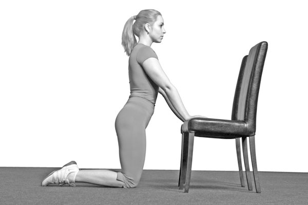 И. П.: стоя у стула. Ноги на ширине плеч. Руками держитесь за спинку стула. Медленно приседайте на максимально возможный угол. На выдохе садиться и на выдохе вставать. Не опускаться ниже 90° (бедро параллельно полу) первые шесть месяцев. 10–20 повторений.