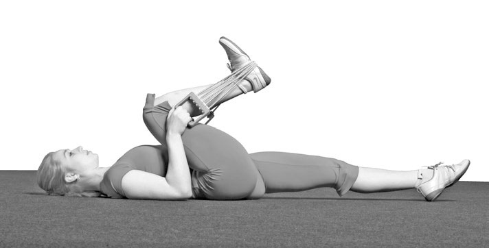 И. П.: лежа на спине. Нога согнута в колене. Эспандер перекинуть через середину стопы и взяться за ручки. Полностью разгибать ногу в коленном суставе, несмотря на боль в мышцах под коленом (на выдохе), удерживать локти на полу. С каждым разом ручки эспандера держать ближе к плечам. Делать поочередно правой и левой ногой. Добиться того, чтобы разгибание стало безболезненным. Выполнять ежедневно. Желательно утром и вечером по 10–20 повторений с эспандером и 1–2 раза взявшись за стопу рукой.
