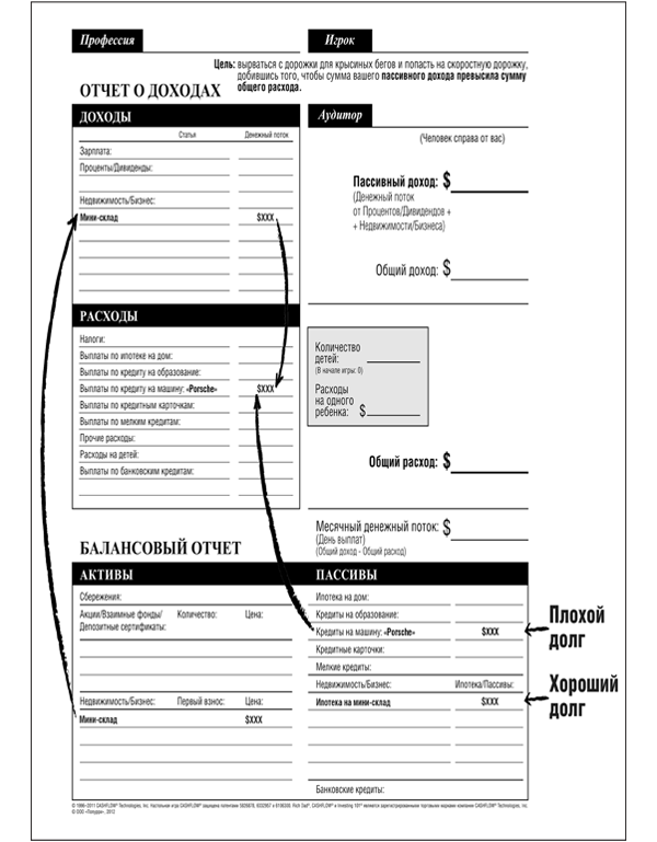 Богатый папа подчёркивал важность финансовой грамотности и того факта, что после завершения учёбы вашим табелем успеваемости станет финансовый отчёт. Ниже приводится финансовый отчёт, в котором показано, как благодаря своим активам я купил пассивы в случае сделки с «Porsche».