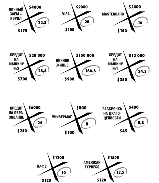 Например, если ваш долг по кредитной карте Visa составляет $2000, а минимальный месячный платеж – $100, тогда: $2000/$100 = 20. Поставьте цифру 20 в правом нижнем углу и обведите красным кружком.