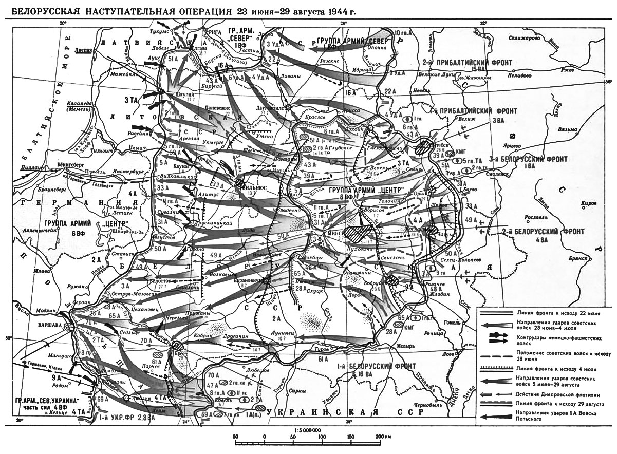 Эти крупные города плюс реки Днепр, Друть, Березина, Свислочь и ряд мелких, сильно заболоченных рек и речушек составляли сильную основу глубоко эшелонированной обороны противника, которая прикрывала важнейшее западное варшавско-берлинское стратегическое направление. Несмотря на то что для разгрома группы армий «Центр» Ставка сосредоточивала значительные силы, все же мы считали, что для успеха операции нужна особо тщательная подготовка войск, участвующих в операции «Багратион».