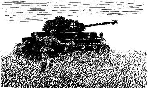 Недалеко от наших окопов находился наблюдательный пункт. Два советских бойца, два солдата-разведчика, прижались к земле и следили за движением вражеских танков.