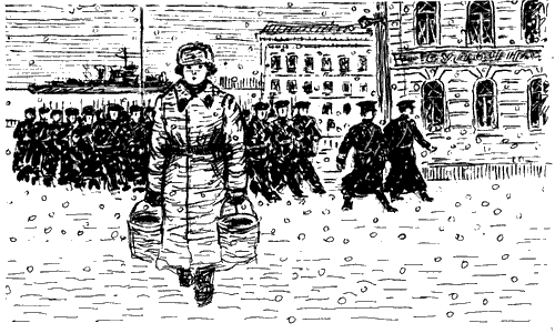 Город спасала река Нева. Здесь в невском льду прорубили проруби. С самого утра тянулись сюда ленинградцы. Шли с вёдрами, с кувшинами, с бидонами, с кастрюлями, с чайниками. Шли цепочкой, один за одним. Старики здесь, старухи, женщины, дети. Нескончаем людской поток.