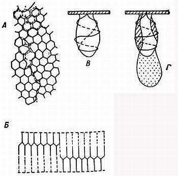 А — сплошной линией показана первая фаза реконструкции, пунктиром — вторая. Б — изменение глубины ячеек в результате изменения положения одной части сота относительно другой; пунктиром показаны достроенные стенки; так пчелы восстанавливают параллельность плоскостей, на которых расположены выходы ячеек. В — сот дважды обвит шнурком; Г — заштрихованы части, которые поело этого были разрушены пчелами, после чего шнурок соскользнул (по Даршену).