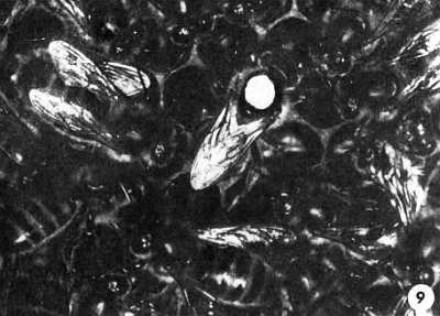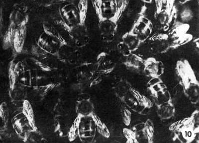 9. МАТКА, ОКРУЖЕННАЯ РАБОЧИМИ ПЧЕЛАМИ, ОТКЛАДЫВАЕТ ЯЙЦА. НА ГРУДИ У НЕЕ МЕТКА. КАЖДЫЙ ГОД НАКЛЕИВАЮТ МЕТКУ НОВОГО ЦВЕТА.