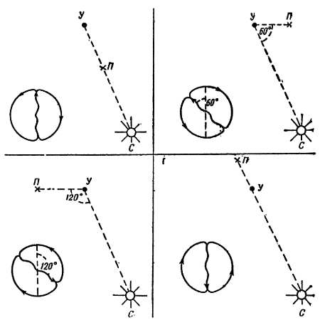 У — улей; П — пища; С — солнце. На каждом рисунке слева изображена «восьмерка» и показан угол, который образует ось фигуры с направлением силы тяжести. Стрелка показывает направление головы танцовщицы (по Фришу).