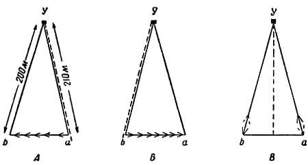 Пчела из улья (У) только что получила корм в точке а; ее перемещают на 30° в точку b (А); Б — обратное положение: пчела, которая кормилась сначала в точке Ь, перенесена в точку а. Результат тот же, в том смысле, что пчелы, танцуя, указывают (В) направление, соответствующее биссектрисе угла 30° (по Отто).