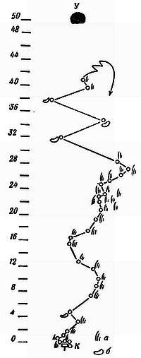 Маленькими кружками обозначены точки ее приземления во время обратного полета; здесь она оставляет пахучий след на траве (а) или на камнях (б). Эти знаки служат путеводной нитью при полете, точно указывая нужное направление. У — улей, К — кормушка с сиропом (по Линдауэру).