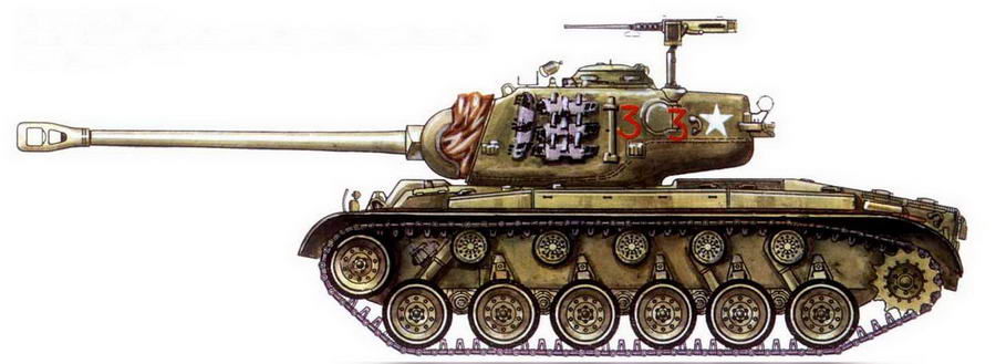 Рота F, 33-й танковый полк 3-й танковой дивизии. Это первый «Першинг», потерянный в бою. Он был подбит 26 февраля 1945 года выстрелом немецкого тяжелого танка «Тигр»