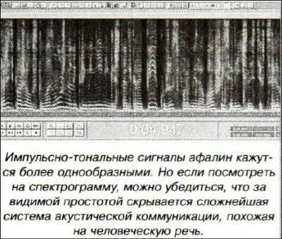 Система свистовых сигналов афалин сводится к совокупности индивидуально-специфичных сигналов («автографов») или их элементов. Ясно, что вряд ли система коммуникации, организованная подобным образом, может быть «открытой». Однако дельфины активно используют еще один тип акустических сигналов — импульсные тона, причем до настоящего времени эти сигналы остаются практически неисследованными.