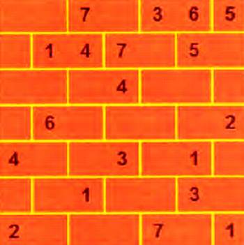 Расставьте цифры от 1 до 7 так, чтобы в каждой строке и в каждом столбце каждая цифра встречалась бы только один раз. На полукирпиче всегда одна цифра, на кирпиче — две, причём одна — чётная, а другая — нет.