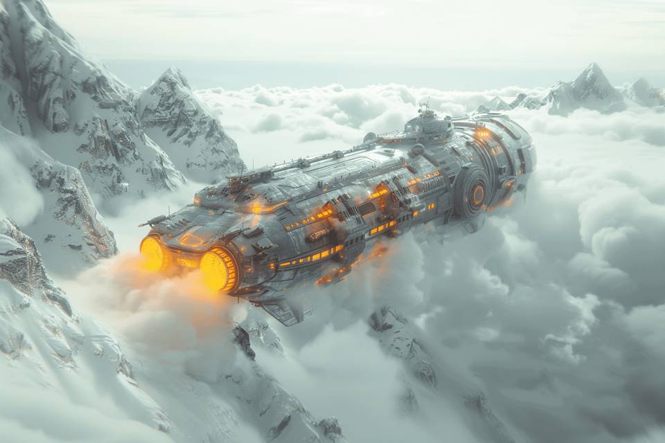 Прямо из облаков перед глазами «всплывало» нечто среднее между ракетой и подводной лодкой. Двойное сопло с энергетическим выхлопом, скайкрафтовый корпус, командирская и боковые башенки — и вся бандура замигала оранжевым, будто там тревога включилась, и начала разворачиваться на меня.