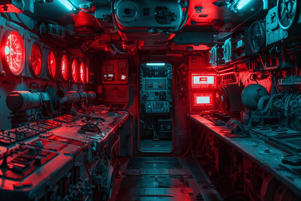 Кажется, оказавшись в машинном зале. Два толстых агрегата, похожих на торпедные аппараты, несколько цистерн по углам и постаменты с монолитами, от которых растекались пучки проводов. Плюс толстая квадратная дверца между двигателями, над которой светилось несколько круглых экранов. Горы угля только не хватало, и считай печь в кочегарке.