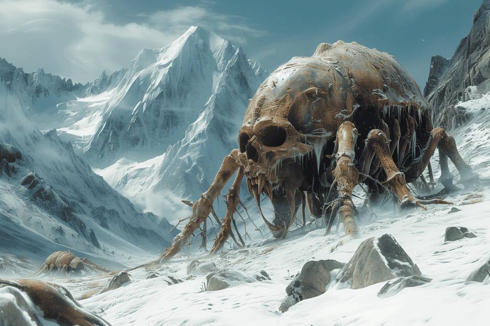 Конкретно сейчас — это был высохший и обветренный панцирь какой-то гигантской (с двухэтажный автобус) блохи или клеща. Такой светло-коричневый приплюснутый бочонок без шеи, но с мордой-черепом. Пустые глазницы, дырка вместо носа и отвисшая до земли челюсть с клыками-бивнями.
