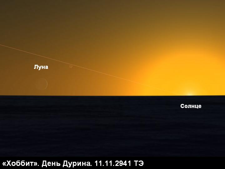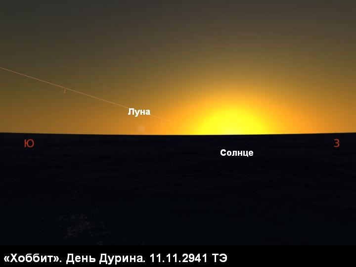В этом фрагменте описана неомения (т.е. первая видимость лунного серпа после новолуния) за полтора месяца до зимнего солнцестояния. Причем по описанию луна была "низкой", т.е. располагалась южнее эклиптики. Новолуние в 2941 г. ТЭ, согласно расчетам, приведенным в статье автора "Принципы реконструкции хронологии событий на примере книги "Хоббит"" [10] , приходилось на 8 ноября. Неомения могла наблюдаться на широте Эребора (54 градуса северной широты) только на третий день. Так как солнце в этот день имеет азимут захода запад-юго-запад, а у эклиптики позднеосенним вечером малый угол наклона к горизонту, луна в силу достаточно большой элонгации (около 40 градусов) могла наблюдаться у самого горизонта на азимуте юго-юго-запад [11] . Однако на карте Трора, где обозначены направления на страны света, мы видим, что по азимуту юго-юго-запад площадку отделяет от горизонта высокий горный отрог. Поэтому сомнительно, что Бильбо смог увидеть заходящую луну. Впрочем, слово автора - закон. Поверим Толкину, ибо в остальном он верно описал "низкую" позднеосеннюю неомению.