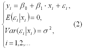 Предположим, что в ходе регрессионного анализа была установлена линейная взаимосвязь между исследуемыми переменными х и у, которая описывается моделью регрессии вида:
