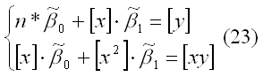 доставляемая процедурой (19) метода наименьших квадратов, может быть вычислена в процессе решения системы двух линейных алгебраических уравнений:
