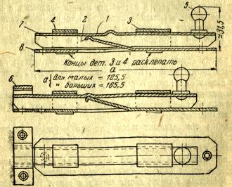 Задвижка, изображённая на рис. 4, состоит из верхнего основания (1), пружины (2), большой скобки (3), малой скобки (4), ручки (5), накладки (6),