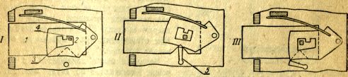 Для удержания ригеля в закрытом или открытом положении в замках имеется дополнительная деталь, называемая цухальтером. На рис. 5—I показан замок в открытом положении; ригель (1) не может передвинуться влево и вправо, так как укреплённая в нём квадратная стойка (4) находиться в выемке (3) цухальтора (2). При повороте ключа (5) (справа налево) бородка его приподнимает цухальтор, и стойка ригеля выходит из углубления в цухальтере. Тогда ригель можно передвинуть влево (рис. 5—II). При дальнейшем повороте ключа бородка его, упираясь в выемку на нижнем крае ригеля, передвигает ригель влево. Одновременно цухальтер постепенно опускается вниз и удерживает ригель в замкнутом положении (рис. 5—(III).