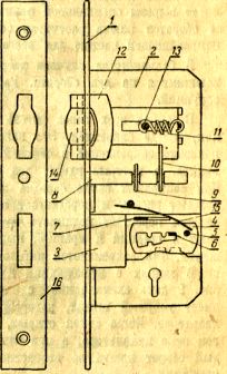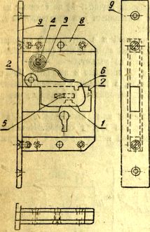 Спереди коробка замка закрыта прямоугольной пластинкой (9) с вырезом для ригеля, которую называют планкой на квадрате. При помощи этой планки замок прикрепляют к двери двумя шурупами. На ключевые отверстия с обеих сторон двери накладывают пластинки (личинки) различной формы.