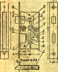 На рис. 7 показан замок с косым засовом, отличающийся от предыдущего тем, что в нём совмещены механизм замка и самозапирающийся косой засов.