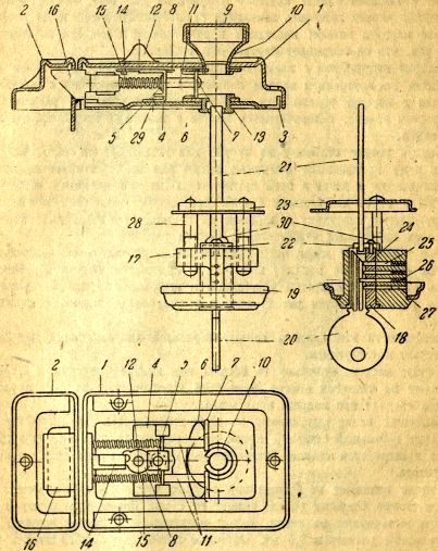 Патрон соединяется с корпусом ригеля пластинкой, один конец которой закреплен на внутреннем валике патрона, а другой вставлен в щель особого кулачка в корпусе ригеля. Эта соединительная пластинка, удерживаясь на внутреннем валике, поворачивается вместе с ним при открывании и запирании замка.