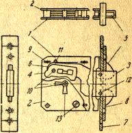 Мебельный замок (рис. 12) состоит из следующим деталей: (1) — нижняя крышка, (2) — верхняя крышка, (3) — ригель, (4) — три цухальтера, (5) — два крючка, (6) — три пружины, (7) — личинка замка, (8) — верхняя личинка, (9) — четыре стойки, (10) — два штифта, (11) — две заклёпки, (12) — ось ригеля, (13) — винт.