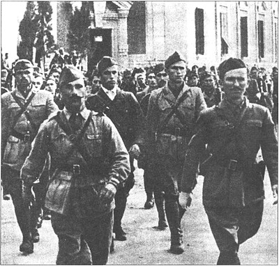 Албанские партизаны маршируют по улицам освобожденной Тираны, ноябрь 1944 года. Обратите внимание на лейтенанта (слева на переднем плане), знаки различия которого расположены на предплечье.