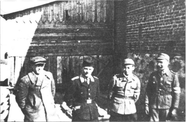 Минск, начало 1944 года. Полицейский из батальона «Шума» носит стандартную униформу, но без кокарды на пилотке. Справа стоят два офицера белорусского отделения «Гитлер Югенд».