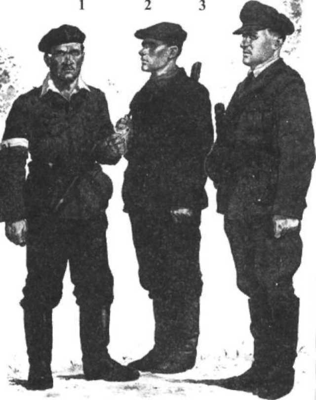 Связь между «малой» и «большой» землями была настолько хрупкой, что партизанам удавалось доставлять лишь самое необходимое. Униформа в список предметов первой необходимости не входила, поэтому партизаны носили каждый свое. Единственной форменной одеждой, доставляемой партизанам по воздуху, были предметы зимнего обмундирования — валенки и полушубки. Некоторые бывшие красноармейцы носили старую униформу, но многие из них сменили ее в первую же зиму. Обычно партизан носили гражданскую одежду. Некоторые партизаны из числа местных крестьян носили традиционные косоворотки и картузы, но большинство советских и немецких фотографий говорят о том, что партизаны предпочитали «пролетарскую» одежду: мешковатые пиджак и брюки с вездесущей кепкой. По соображениям безопасности, знаки различия не носили. Партизан обут в высокие сапоги, в остальном его одежда ничем не отличается от обычной одежды городского рабочего. Партизан вооружен эффективным пистолетом-пулеметом Шпагина (ППШ-41).