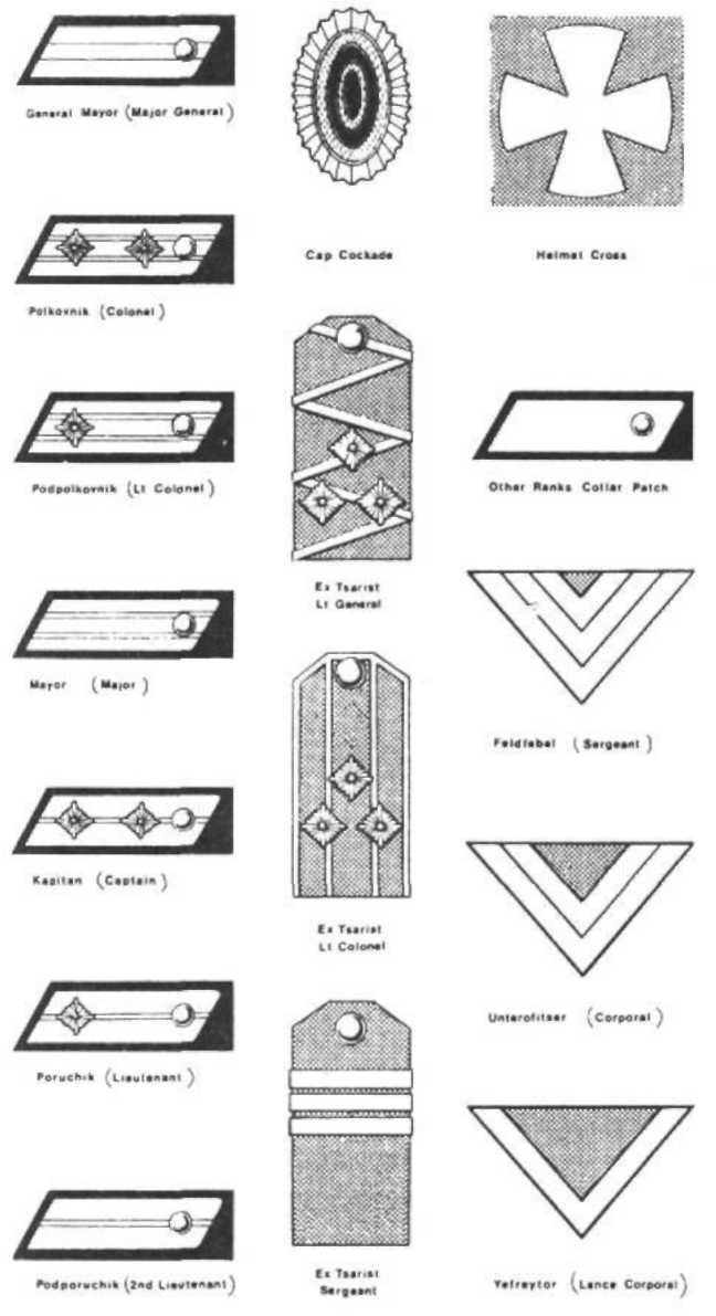кокарда: оранжево-черно-серебряная. Крест белый. Петлицы красные (пехота), желтые (кавалерия), голубые (казаки). Генерал-майор; золотой просвет, другие офицеры: серебряные просветы и шишечки, унтер-офицеры: серебряные шевроны. Генеральские погоны украшались золотым галуном, погоны офицеров были цвета рода войск. Погоны старших унтер-офицеров украшались толстым золотым или желтым галуном, прочих унтер-офицеров — тонким белым галуном. Цвет унтер-офицерских погон — коричневый или хаки. Рядовым (стрелок или казак) знаков различия не полагалось.