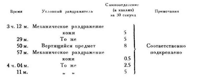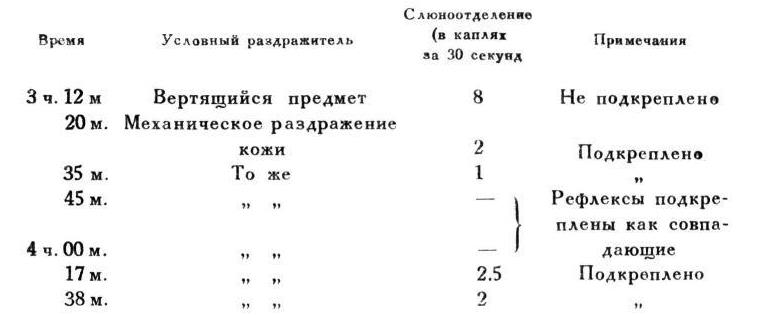 Наконец мы собрали некоторый материал относительно ротового химического анализатора. Тут дело принимает у нас несколько иной вид, так как оба наших обычных безусловных рефлекса относятся именно к вкусовому анализатору. Чтобы быть в одинаковом положении с изучением других анализаторов, следовало бы иметь безусловный раздражитель, принадлежащий к тому или другому из этих анализаторов, а химические раздражения полости рта применять в качестве условных. Мы таких опытов не делали, а заменили их до известной степени другой формой опытов: взаимодействием, задерживанием одного другим, условных рефлексов, образованных на разные пищевые и отвергаемые вещества (мясной порошок, сухарный порошок, сахар, сыр, кислота, сода и т. д.). Вот пример таких опытов из работы Я. И. Егорова.