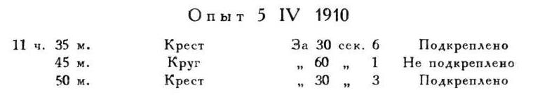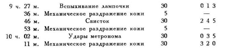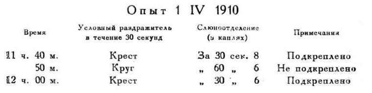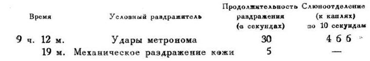 У собаки положительными условными раздражителями были: удары метронома, свисток, вспыхивание лампочки и механическое раздражение кожи. В данноме раздражался оказавшийся после операции недействительным пункт кожи на предплечье. Отделение слюны отмечалось в делениях трубки; 5 делений которой отвечают 1 капле. Отделение у собаки постоянно небольшое. Судорог у собаки после операции замечено не было.