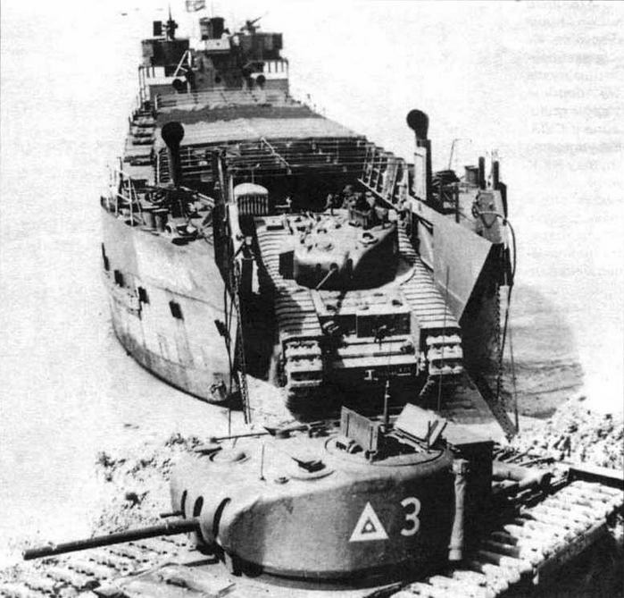 Танки «Черчилль II» во время учений покидают танкодесантный корабль. 1942 год
