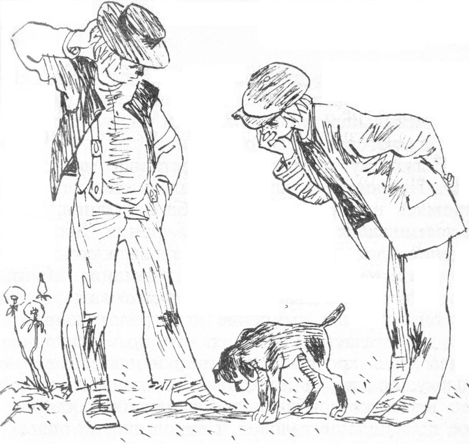 На тротуаре стоял Сэм Уильямс. Он явно пребывал в самом радостном расположении духа. В его правой руке был зажат конец бельевой веревки, а другой конец обхватывал шею щенка. Но щенок сопротивлялся доморощенному ошейнику, который по этой причине съехал ему на уши. Вот почему лоб у щенка наморщился, шея вытянулась, а голова приняла горизонтальное положение. Строго говоря, щенок сидел на земле, это только Сэму казалось, будто он ведет его на поводке.