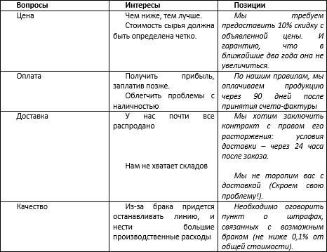 В процессе обдумывания тактики и стратегии переговоров, я всякий раз поясняю участникам, как важно вовремя отделить силу позиции от интересов. Вас должна интересовать не столько позиция оппонента как таковая, сколько те интересы, которые за ней стоят. Во время тренинга, который проводился в крупной компании по производству рекламной продукции (они снимали видеоклипы), я предложил людям, конкретно отвечавшим за подготовку и проведение переговоров, просчитать и спрогнозировать, какие интересы может преследовать другая сторона.