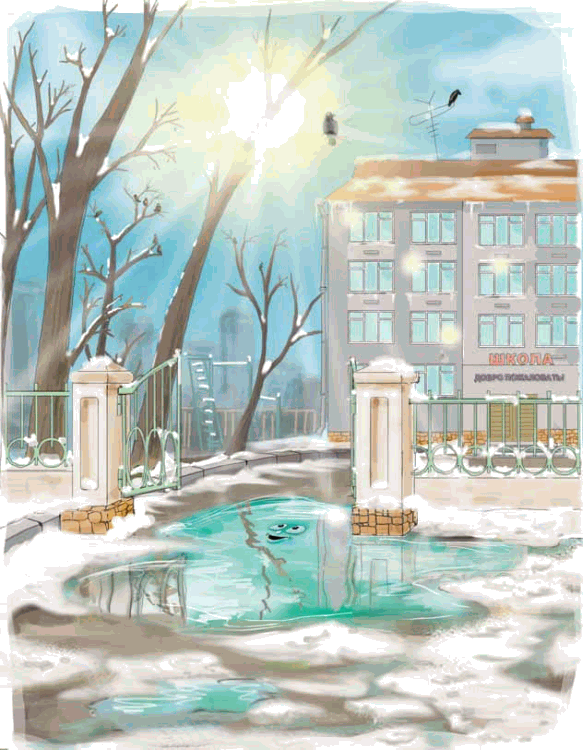 В один из ясных мартовских дней на дорожке у школьных ворот родилась лужа. Она тут же поймала солнечный лучик и просияла: