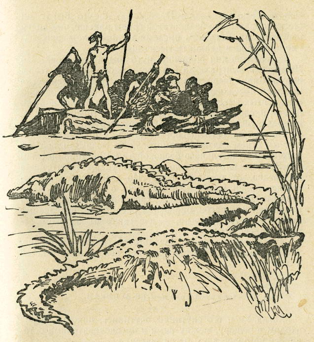 Плот плыл по Большой реке, крутясь среди водоворотов, увлекаемый вперед бурным течением. Несколько раз в особо опасных местах женщины спрыгивали с плота в воду, чтобы облегчить незавершенное сооружение, грозившее вот-вот развалиться. Но вскоре они вынуждены были отказаться от подобных действий, Так как вокруг плота то и дело появлялись крокодилы.